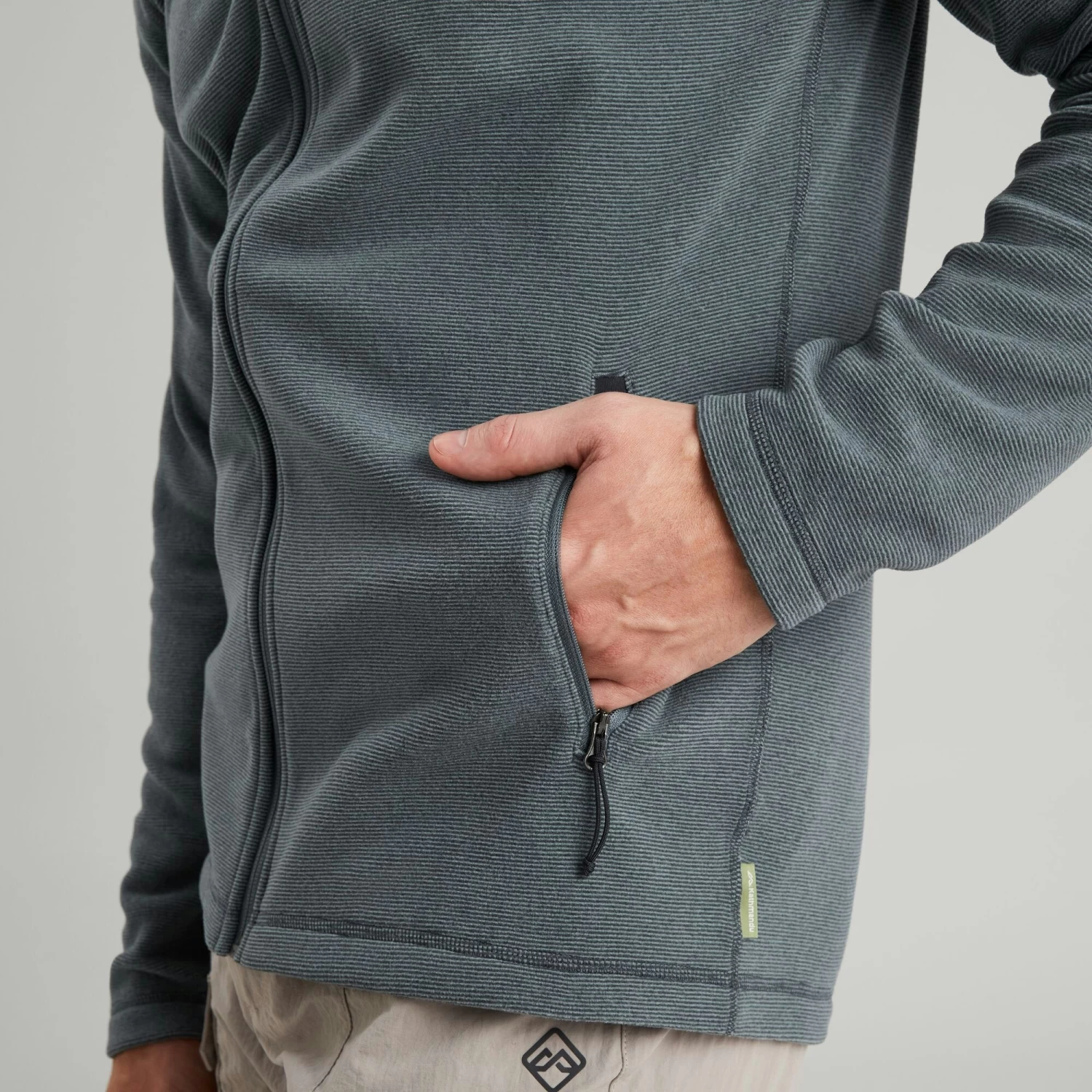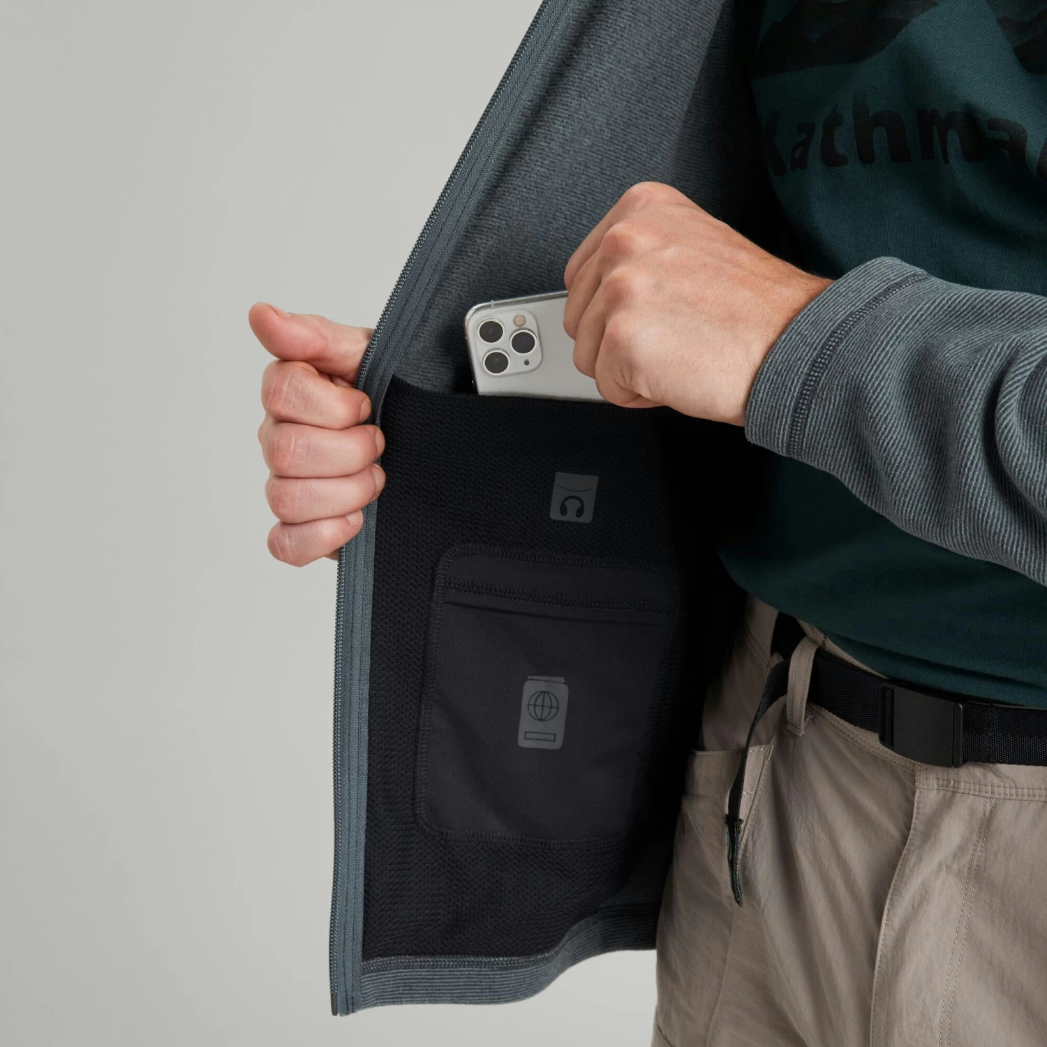- Front zip security pockets for storage and hand warming